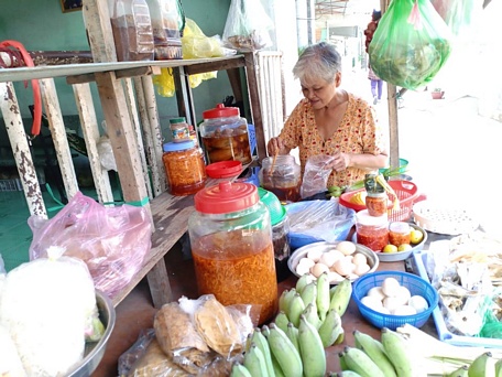 Hồi trước bà bày bán trong chợ, nhưng già yếu bán buôn cũng không có bao nhiêu, đóng tiền thì thêm nặng chi phí nên mấy năm nay bà dời về bán tại nhà cách chợ tầm 100m, nhưng ai có mua mắm, mua rau bào thì mọi người đều chỉ tay về quán bà Sáu. Hai vợ chồng già sống trong căn nhà nhỏ, có 3 người con mà ai cũng làm ăn xa nên thành ra đơn chiếc. Có người con trai cũng trôi dạt đầu này, xứ nọ bà Sáu phải nuôi đứa cháu nội từ hồi nó chưa dứt sữa giờ đã lớn bộn học tới lớp 5 rồi mà chẳng mấy khi thấy cha mẹ nó về thăm. Cả nhà nhờ vào cái quán nhỏ xíu đó, phần già cả chậm chạp nên bán buôn hàng hóa đâu bằng người ta, được cái nhờ nhiều người thương mà ủng hộ.