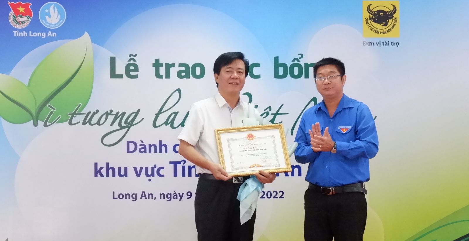 Bí thư Tỉnh đoàn Long An - Võ Trần Tuấn Thanh trao Bằng khen của UBND tỉnh cho Công ty Cổ phần Phân bón Bình Điền