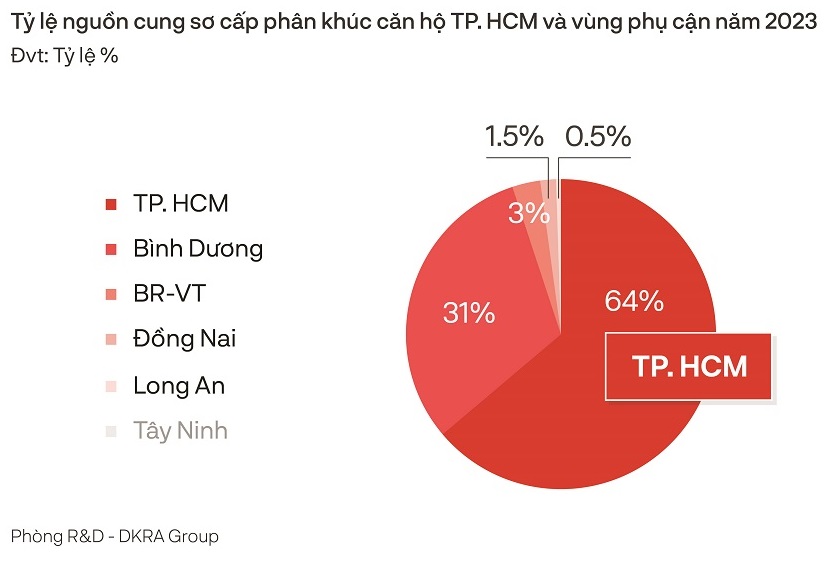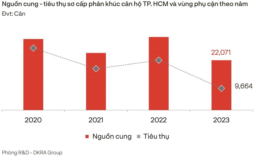 Phân khúc căn hộ ghi nhận 126 dự án sơ cấp triển khai bán hàng (khoảng 22,071 căn) trong năm, giảm 32% so với năm 2022, đây cũng là mức thấp nhất trong vòng 5 năm qua. Nguồn cung mở bán phân bổ chủ yếu tại TP.HCM (tập trung tại khu Đông) và Bình Dương. Lượng tiêu thụ đạt khoảng 9,664 căn, bằng 44% nguồn cung sơ cấp và giảm 56% so với năm 2022.