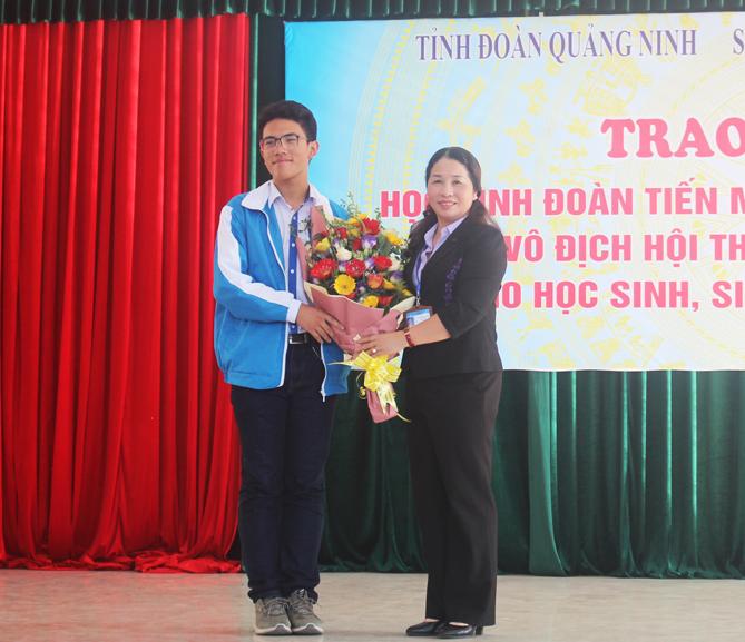 | Học sinh Đoàn Tiến Mạnh, Trường THPT Hòn Gai vinh dự đón nhận phần thưởng của Sở Giáo dục và Đào tạo Tỉnh Quảng Ninh. (Ảnh: Thu Chung) |