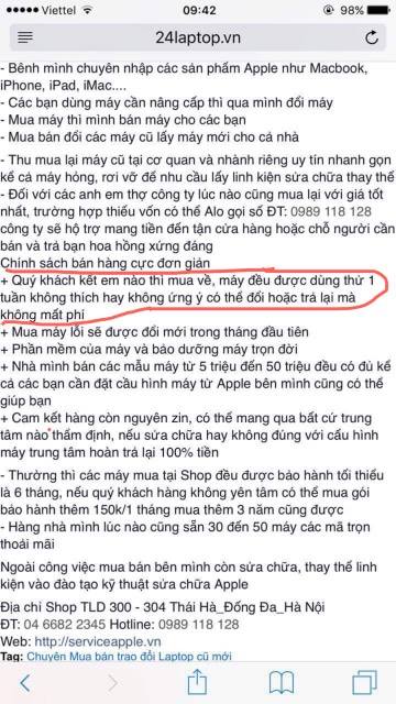 Theo lời quảng cáo trên website 24laptop.vn và serviceapple.vn… với những chính sách bán hàng rất là hấp dẫn như: được dùng thử 01 tuần không thích hay không ưng ý đều có thể đổi hoặc trả lại mà không mất phí; máy lỗi được đổi trong tháng đầu tiên; phần mềm được bảo hành trọn đời; lúc nào cũng có sẵn 30- 50 máy các mã để chọn. Địa chỉ các website trên thuộc quyền quản lý của Công ty CP Xây dựng thế giới số TLD, địa chỉ đăng ký kinh doanh tại Thôn 1, xã Song Phương, huyện Hoài Đức, TP.Hà Nội và địa chỉ shop bán hàng tại 300 – 304 phố Thái Hà, Đống Đa, Hà Nội.