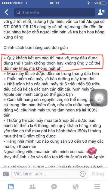 Tin tưởng vào những lời quảng cáo, giới thiệu trên website, lại càng tin hơn khi được một cộng tác viên của công ty giới, anh H đã tìm đến địa chỉ này để mua một chiếc máy tính xách tay nhãn hiệu Macbook Air đã qua sử dụng, còn 99% với số tiền là 17.300.000đ. Vì chính sách đổi trả miễn phí trong vòng một tuần nên anh H rất yên tâm trả tiền và mang máy về dùng thử.