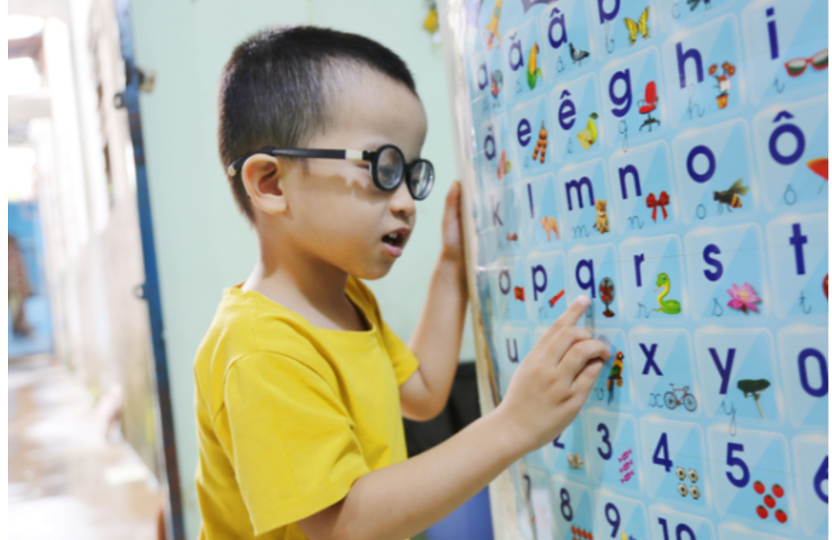 Ngồi trong lòng mẹ, Gia Anh đưa đôi bàn tay tìm những món đồ chơi mà con thích, chốc chốc lại quay sang làm nũng, í ới gọi bố. Suốt 3 năm nhòn thấy ánh sáng mặt trời, con đã tập cho mình những thói quen riêng biệt. Nhìn vào bảng chữ cái gắn trên tường nhà, Gia Anh bập bẹ đọc từng chữ một.
