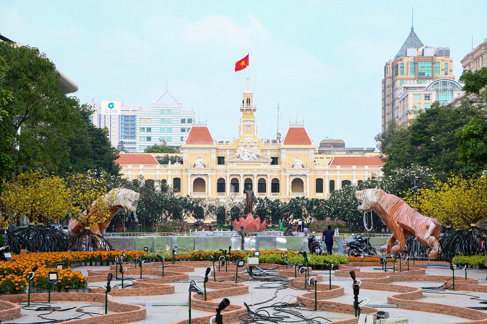 Đơn vị tổ chức đang gấp rút hoàn thành Đường hoa Nguyễn Huệ Tết Nguyên Đán Nhâm Dần 2022 theo đúng tiến độ - Ảnh: Thuận Văn