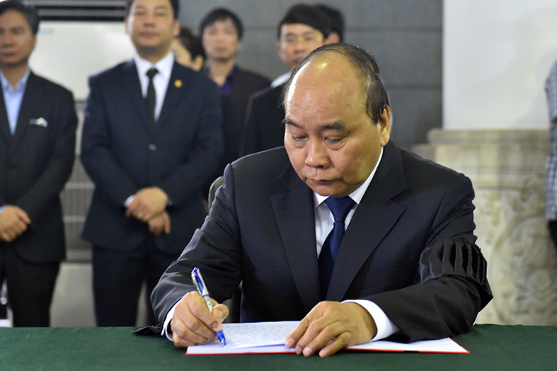 | Thủ tướng Chính phủ Nguyễn Xuân Phúc viết sổ tang. Ảnh: VGP/Nhật Bắc |