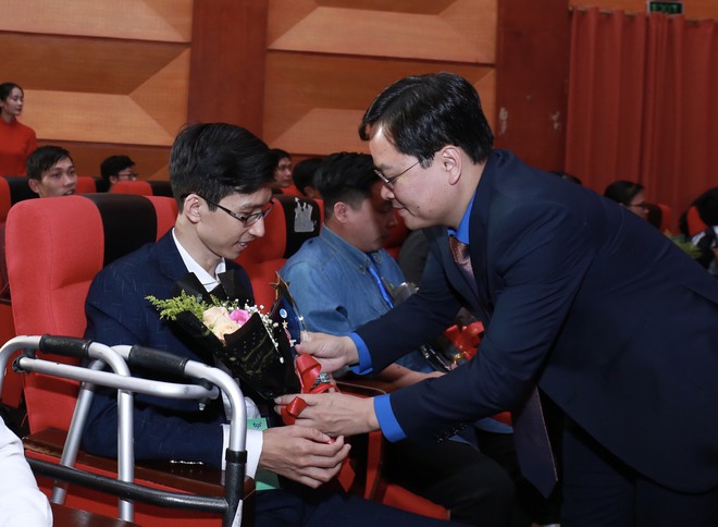 Đồng chí Nguyễn Anh Tuấn, Bí thư thứ nhất Trung ương Đoàn; Chủ tịch Trung ương Hội LHTN Việt Nam vinh danh gương thanh niên khuyết tật tiêu biểu năm 2020.