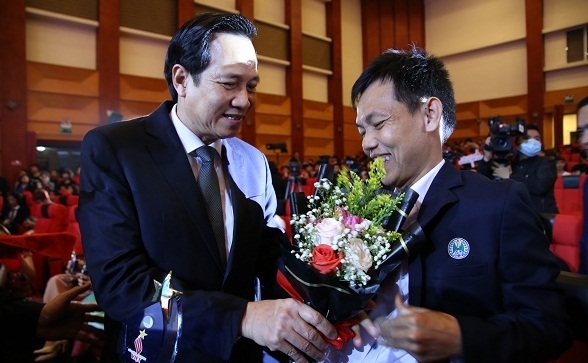 Ông Đào Ngọc Dung tặng hoa động viên một thanh niên khuyết tật được tôn vinh tại chương trình.