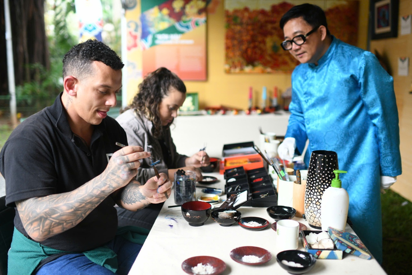 Được tự tay tạo tác bức tranh sơn mài của mình, các bạn trẻ Bra-xin say mê với từng nét cọ tinh tế và lớp màu óng ánh. Họ hiểu rõ hơn về sự kỳ công và nét đẹp sáng tạo của nghệ thuật sơn mài Việt Nam.