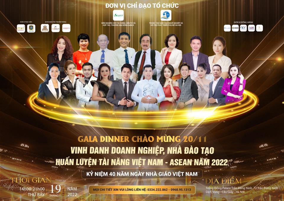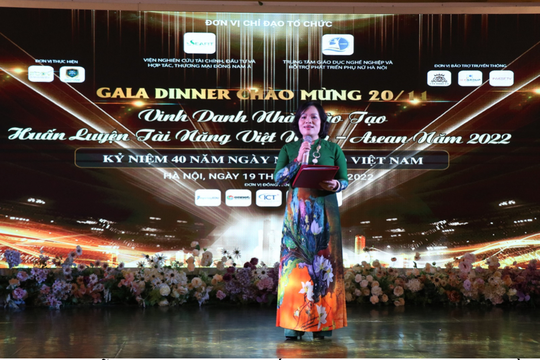 Ngày 19/11/2022 vừa qua, Trung tâm Giáo dục nghề nghiệp và Hỗ trợ phát triển phụ nữ Hà Nội phối hợp Viện Nghiên cứu Tài chính, Đầu tư và Hợp tác thương mại Đông Nam Á, cùng đơn vị đồng thực hiện CoachTech Group - Hội đồng Nhà huấn luyện và Phát triển doanh nghiệp Việt Nam đã tổ chức thành công chương trình Gala Dinner Vinh danh Doanh nghiệp, Nhà đào tạo - Huấn luyện tài năng Việt Nam – ASEAN 2022. Chương trình nhằm hướng tới nhân dịp Lễ kỷ niệm 40 năm ngày Nhà giáo Việt Nam 20/11.