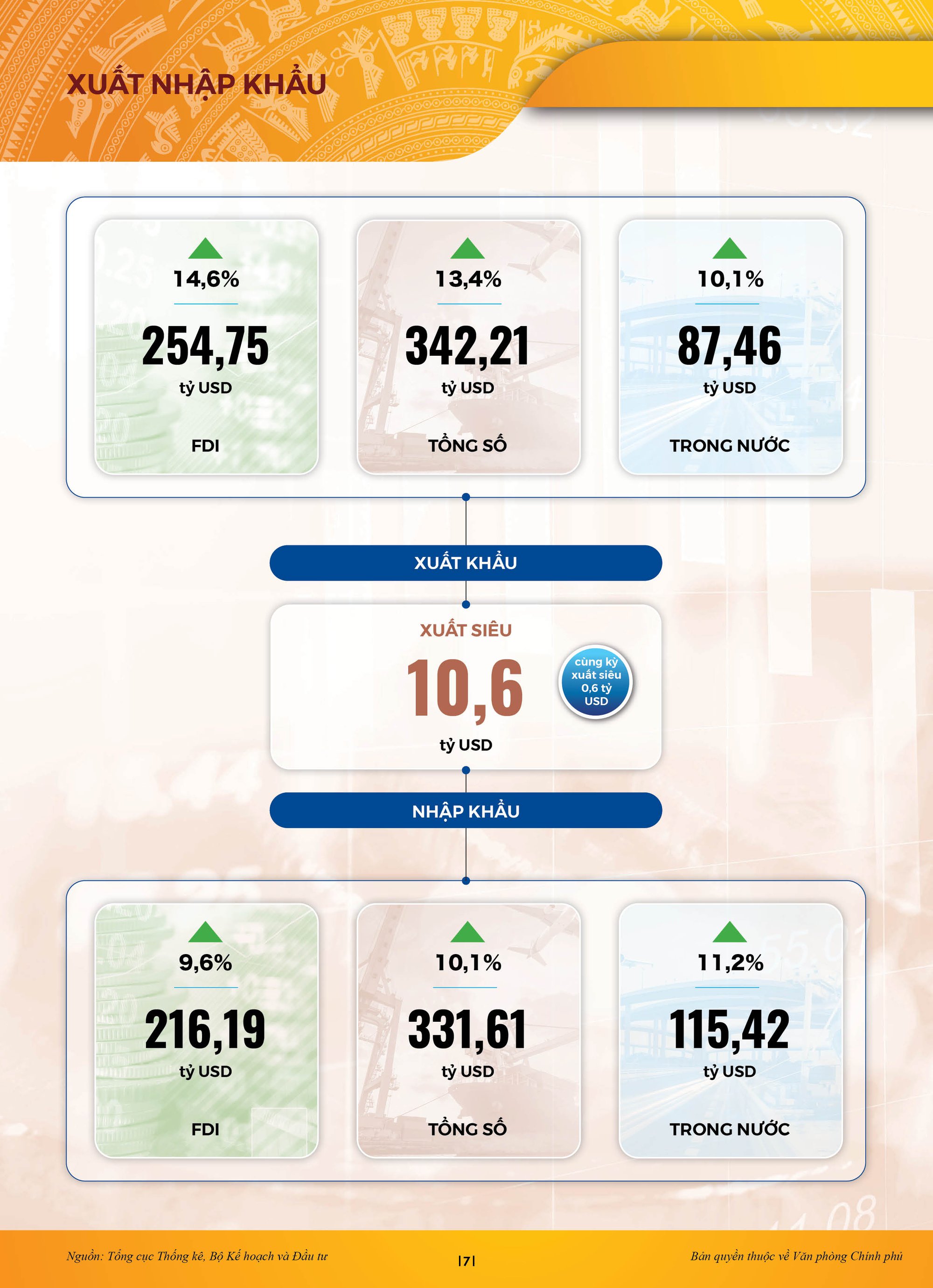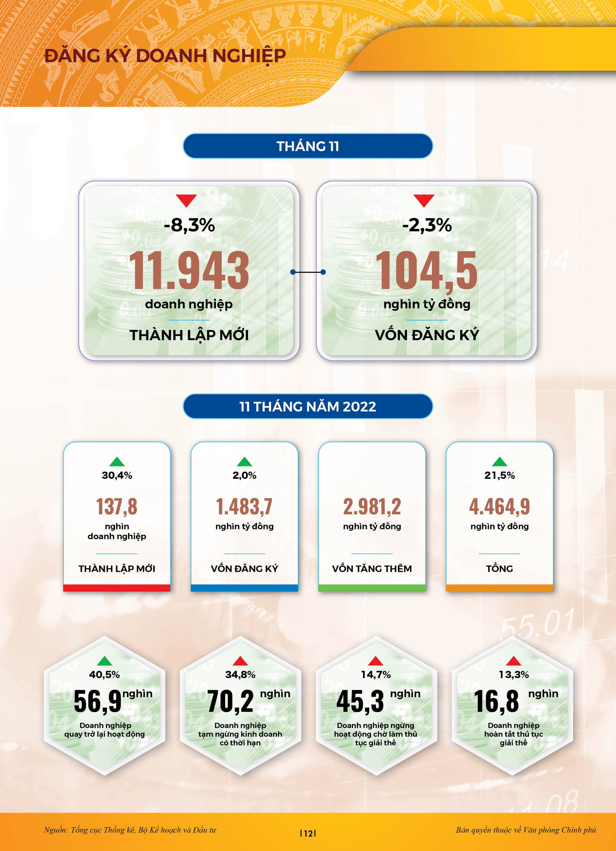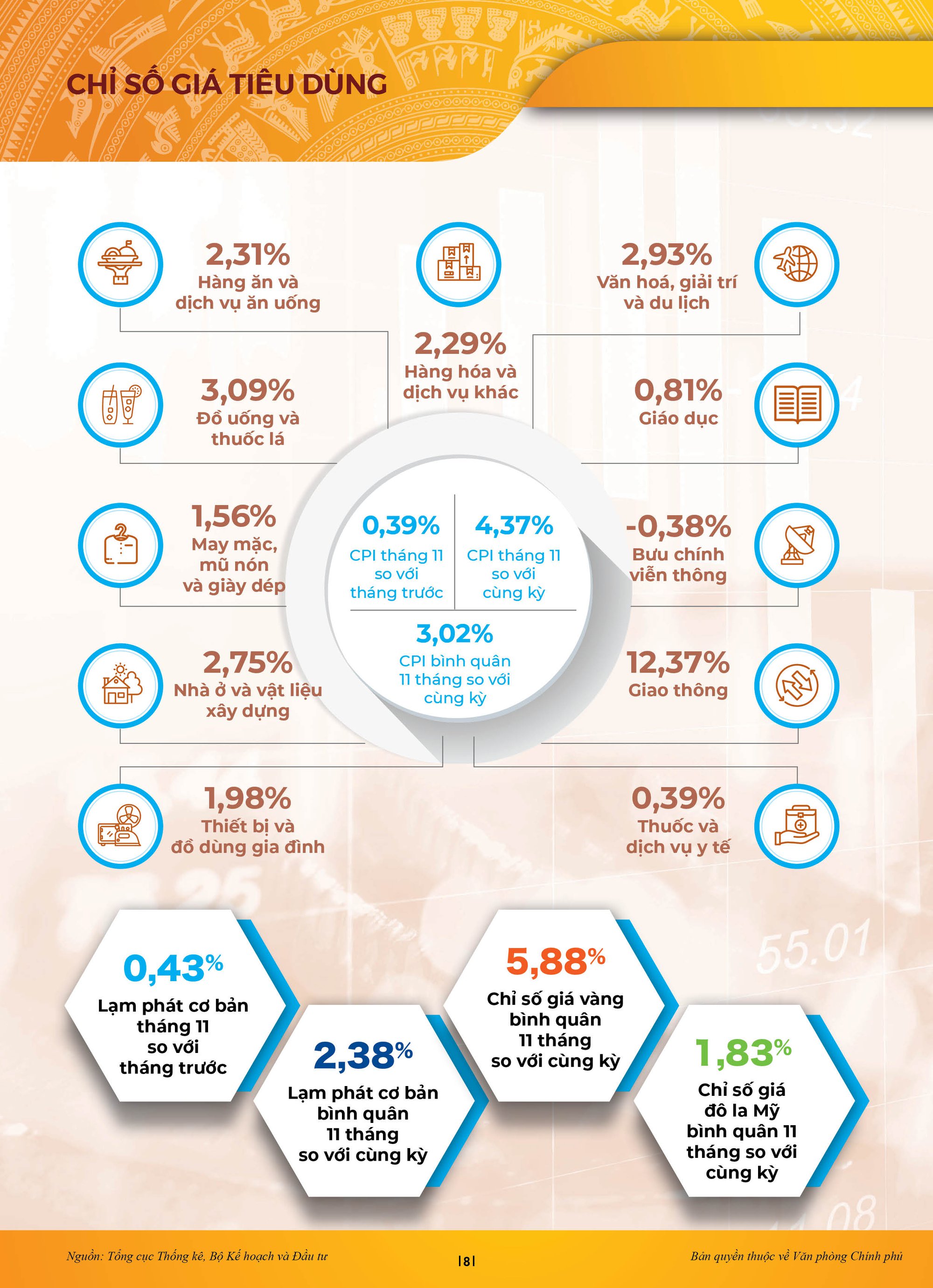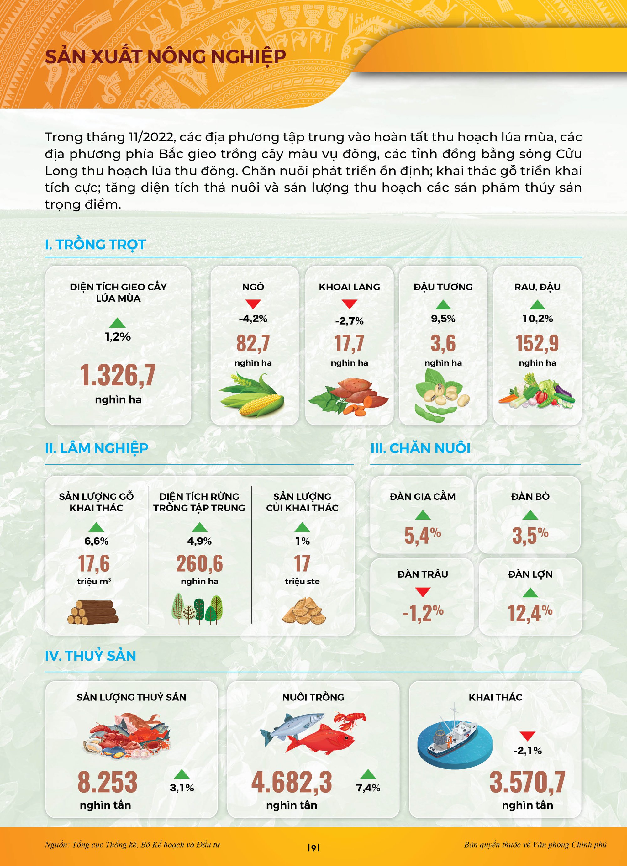 Tháng 11 và 11 tháng năm 2022, tình hình kinh tế-xã hội khởi sắc trên hầu hết các lĩnh vực với nhiều điểm sáng. Theo đó, kinh tế vĩ mô duy trì ổn định; lạm phát được kiểm soát, chỉ số giá tiêu dùng bình quân 11 tháng tăng 3,02%. Các cân đối lớn được bảo đảm, trong đó thu ngân sách Nhà nước 11 tháng ước vượt 16,1% dự toán, xuất siêu 10,6 tỷ USD, cung ứng lao động cơ bản đáp ứng nhu cầu.