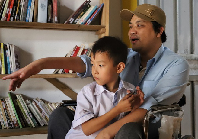 Đầu giờ chiều, đám trẻ trong làng chạy ùa tới căn nhà nhỏ của anh Phùng Văn Trường. Không cần nhắc, từng cháu để gọn cặp một góc, lấy sách vở ra rồi tự giác ngồi vào bàn. Thấy "học sinh" đến, người đàn ông mặc bộ quần áo cũ kĩ xin "khất" chuyện chúng tôi, đẩy chiếc xe lăn bằng đôi tay bị khoèo đi vào khoảng trống hình chữ U được kê bởi 3 chiếc bàn để bắt đầu giờ "lên lớp".