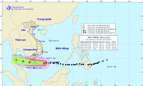 Dự báo trong 24 giờ tới, bão di chuyển chủ yếu theo hướng Tây, tốc độ di chuyển 20-25km/h, đến 07 giờ ngày 26/12, vị trí tâm bão ở vào khoảng 8,5 độ Vĩ Bắc; 104,7 độ Kinh Đông, trên khu vực Tây Nam Bộ. Sức gió mạnh nhất ở vùng gần tâm bão mạnh cấp 8-9 (60-90km/giờ), giật cấp 11-12.