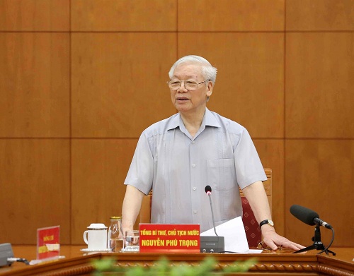 | Tổng Bí thư, Chủ tịch nước Nguyễn Phú Trọng, Trưởng Tiểu ban Văn kiện Đại hội XIII của Đảng chủ trì cuộc họp. Ảnh TTXVN |