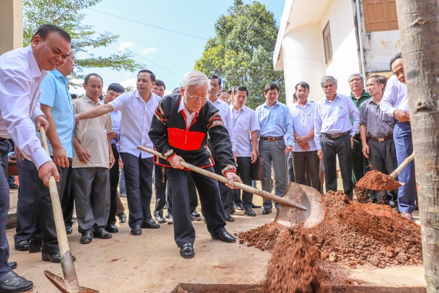 | Tổng Bí thư, Chủ tịch nước Nguyễn Phú Trọng chung vui Ngày hội Đại đoàn kết cùng đồng bào xã Dur Kmăl, huyện Krông Ana, Đắk Lắk. |