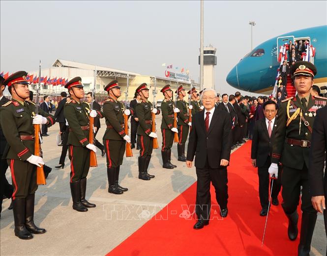 | Lễ đón Tổng Bí thư, Chủ tịch nước Nguyễn Phú Trọng tại sân bay quốc tế Wattay. Ảnh TTXVN |