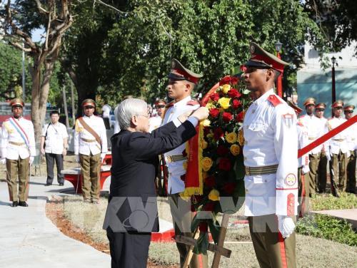 Ngay sau khi đến Thủ đô La Habana, Tổng Bí thư Nguyễn Phú Trọng và Đoàn đại biểu cấp cao Việt Nam đã đến đặt vòng hoa tại Tượng đài Chủ tịch Hồ Chí Minh ở Công viên Hòa Bình, tưởng nhớ vị lãnh tụ kính yêu của nhân dân Việt Nam, người bạn lớn của nhân dân Cuba anh em.