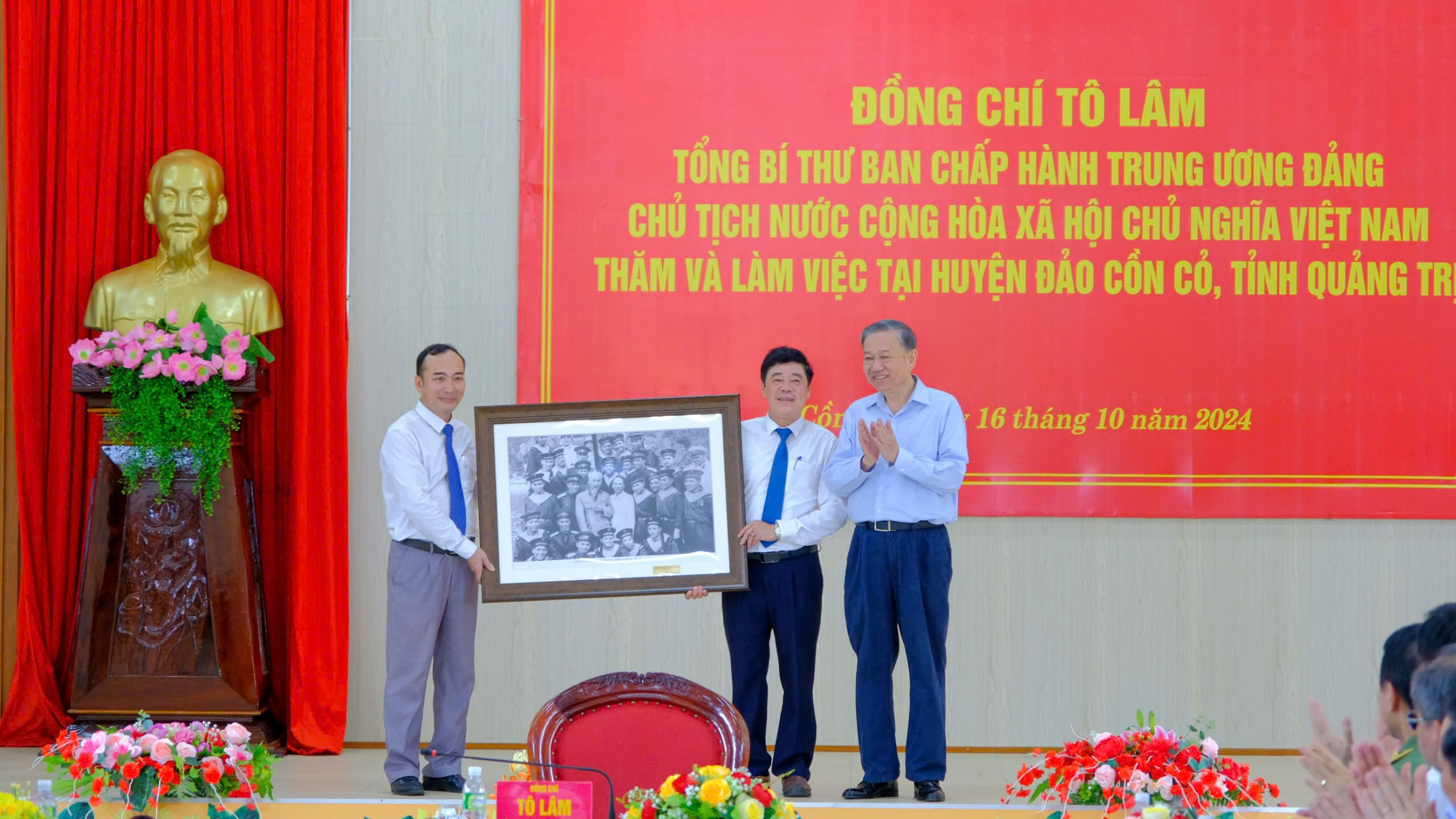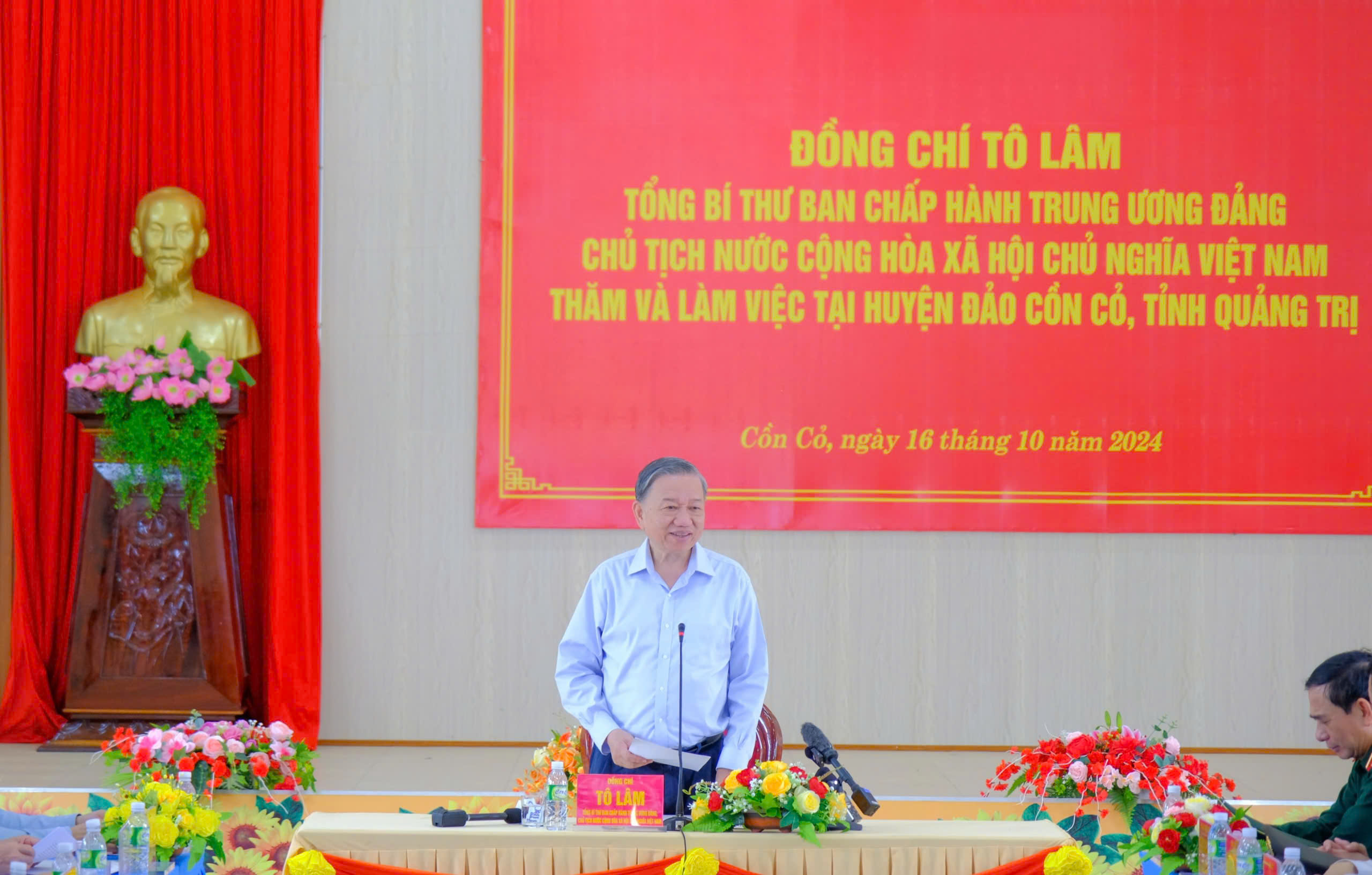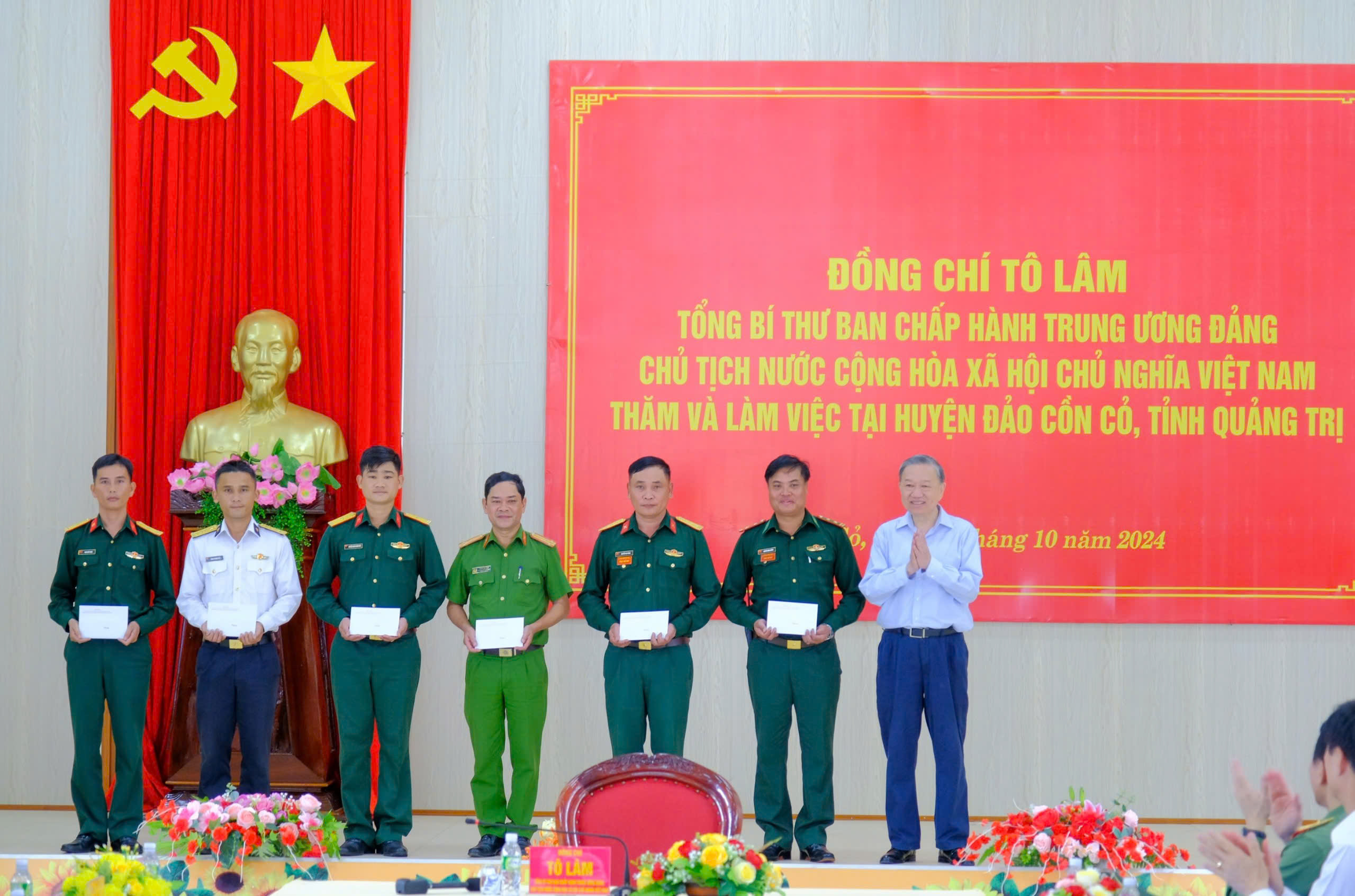 Tiếp tục chuyến công tác tại tỉnh Quảng Trị, ngày 16/10, Tổng Bí thư, Chủ tịch nước Tô Lâm cùng đoàn công tác Trung ương đến thăm cán bộ, quân, dân huyện đảo Cồn Cỏ, tỉnh Quảng Trị. Cùng đi có các Ủy viên Bộ Chính trị: Đại tướng Phan Văn Giang, Bộ trưởng Bộ Quốc phòng; Thượng tướng Lương Tam Quang, Bộ trưởng Bộ Công an.