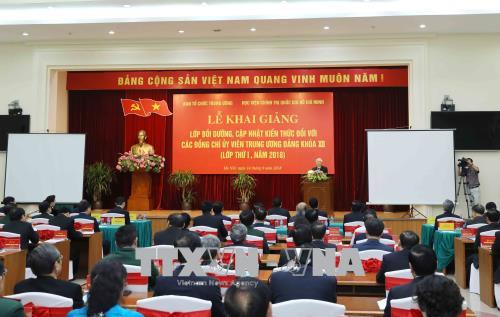 Phát biểu chỉ đạo, khai giảng lớp học, thay mặt Bộ Chính trị, Ban Bí thư, Tổng Bí thư Nguyễn Phú Trọng nhiệt liệt chào mừng các đồng chí học viên về dự lớp học đông đủ; hoan nghênh Ban Tổ chức Trung ương, Học viện Chính trị quốc gia Hồ Chí Minh, Hội đồng Lý luận Trung ương, Văn phòng Trung ương Đảng và các cơ quan, ban, ngành có liên quan đã phối hợp chặt chẽ, tích cực chuẩn bị để tổ chức lớp bồi dưỡng quan trọng này theo đúng kế hoạch.