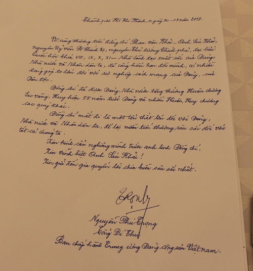 Ghi sổ tang, Tổng Bí thư Nguyễn Phú Trọng viết: “Vô cùng thương tiếc đồng chí Phan Văn Khải - Anh Sáu Khải, nguyên Ủy viên Bộ Chính trị, nguyên Thủ tướng Chính phủ, đại biểu Quốc hội khóa VIII, IX, X, XI - Nhà lãnh đạo xuất sắc của Đảng, Nhà nước và Nhân dân ta, đã cống hiến trọn đời mình, có nhiều đóng góp to lớn đối với sự nghiệp cách mạng của Đảng, của Dân tộc.