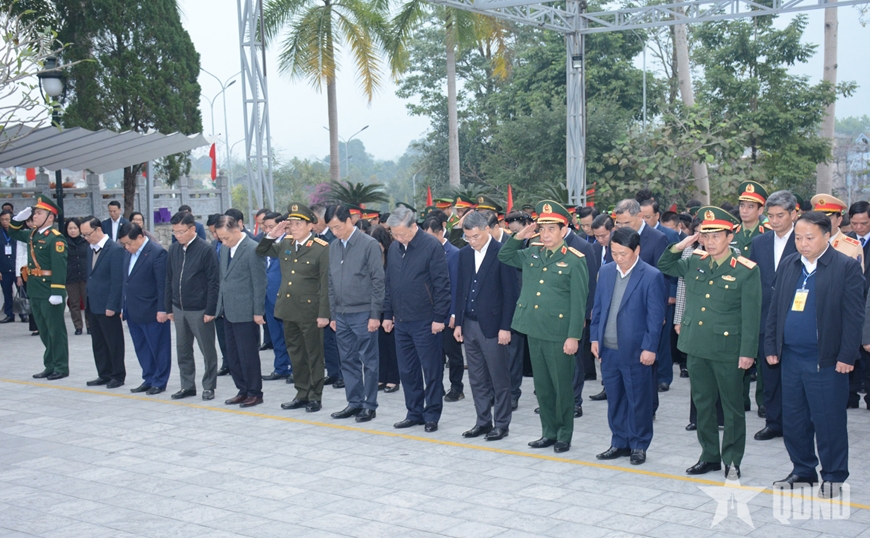 Tổng Bí thư Tô Lâm, Đại tướng Phan Văn Giang và các đại biểu dành phút tưởng niệm các anh hùng liệt sĩ tại Nghĩa trang Liệt sĩ quốc gia Vị Xuyên. Ảnh: CHIẾN VĂN/QĐND