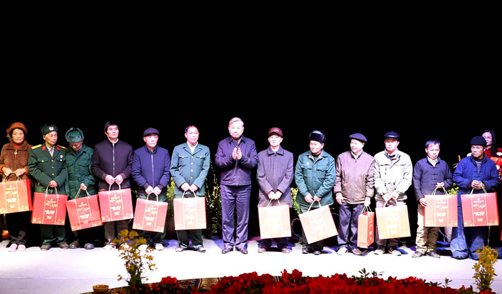 Tổng Bí thư Tô Lâm tặng quà các gia đình chính sách huyện Quản Bạ, tỉnh Hà Giang. Ảnh: BQP