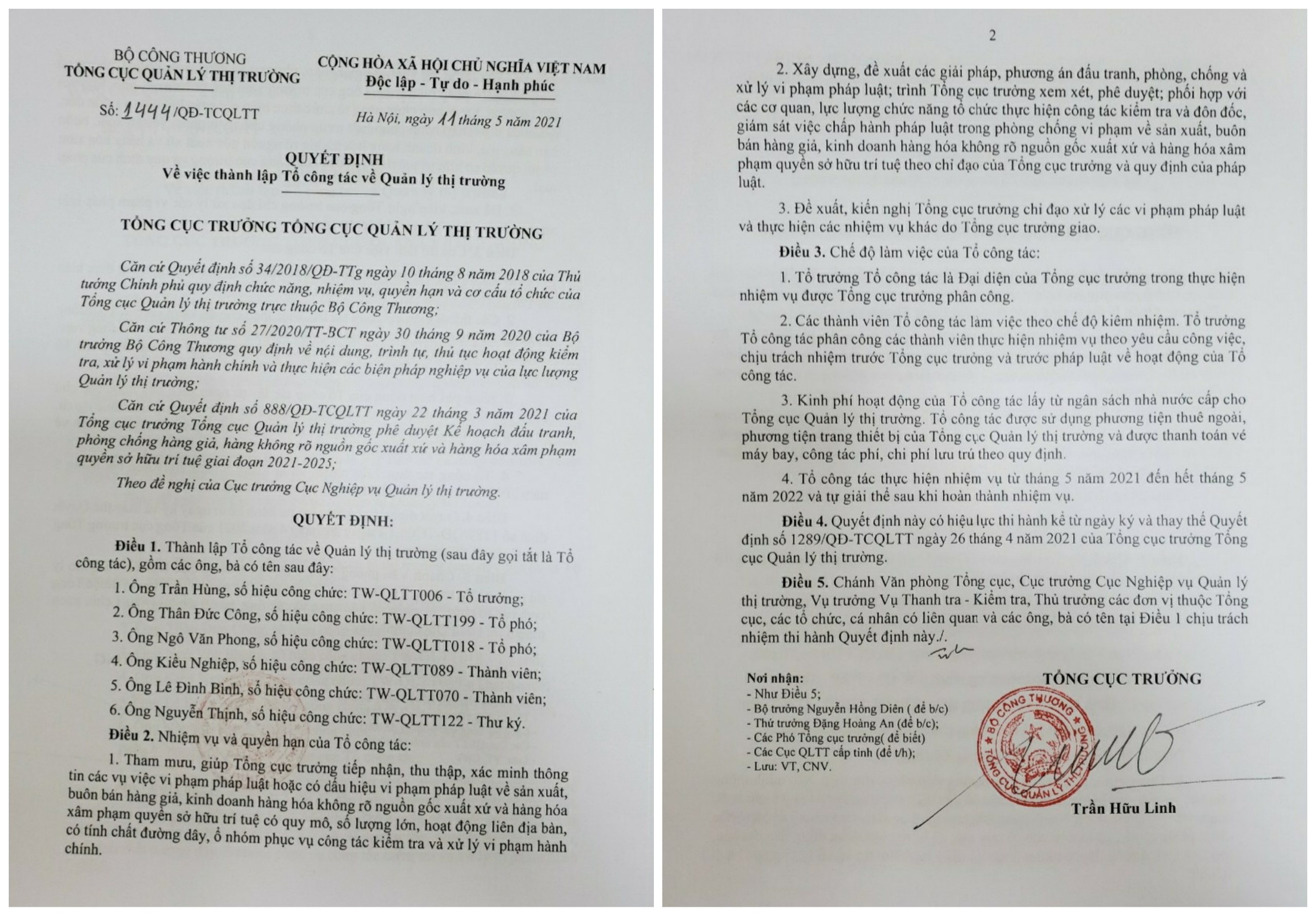 Ngoài ra, việc thành lập Tổ công tác QLTT còn dựa vào Quyết định số 888/QĐ-TCQLTT ngày 22/3/2021 của Tổng cục trưởng Tổng cục QLTT phê duyệt Kế hoạch đấu tranh, phòng chống hàng giả, hàng không rõ nguồn gốc xuất xứ và hàng hóa xâm phạm quyền sở hữu trí tuệ giai đoạn 2011-2025.