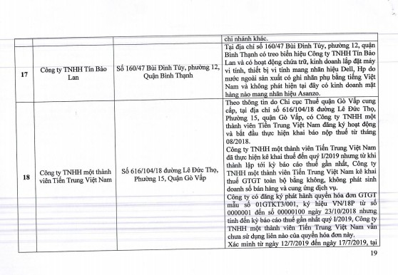 Công ty TNHH Truyền thông Asanzo có địa chỉ tại toà nhà Vincom Center (Bến Nghé, Quận 1), theo xác minh đến 3/9/2017 công ty đã ngừng hoạt động tại địa chỉ này. Trong thời gian thuê, công ty không có bất cứ hoạt động nào tại địa chỉ đã thuê.
