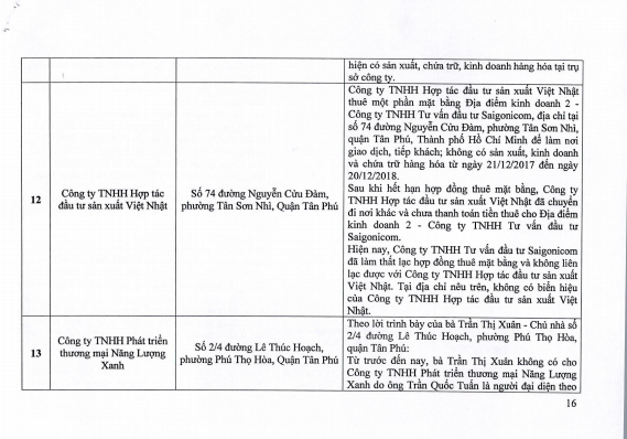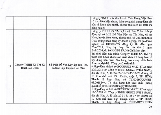 Công ty TNHH Đầu tư Thương mại Xuất nhập khẩu Gia Bảo tại địa chỉ 162/13/12 tại đường TTN08, khu phố 6, phường Tân Thới Nhất (quận 12). Tuy nhiên, theo xác minh đây là nhà ở riêng lẻ nên không có hoạt động sản xuất, chứa trữ, kinh doanh.