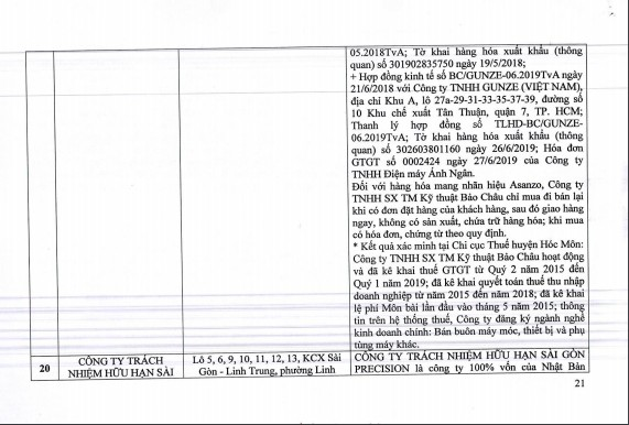 Công ty đăng ký ngành nghề kinh doanh chính là sản xuất linh kiện điện tử. Qua kết quả xác minh, công ty không có hoạt động sản xuất linh kiện điện tử tại địa chỉ đăng ký nên có thể là hoạt động tại một địa chỉ nào khác do có kê khai thuế giá trị gia tăng và quyết toán thuế với huyện Hóc Môn.