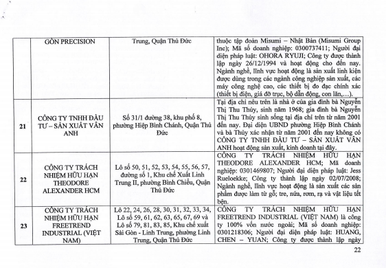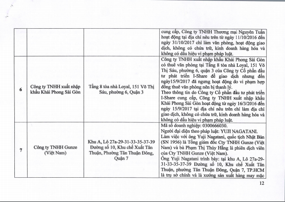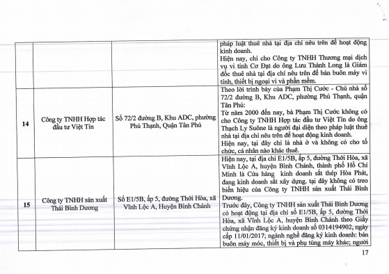Có 3 doanh nghiệp có địa chỉ trụ sở không thuộc địa bàn Tp. HCM gồm Công ty TNHH Poylink. Công ty này đang hoạt động và có địa chỉ tại xã Thuận An (Bình Dương). Người đại diện pháp luật của công ty là Võ Thị Huyền Trân.