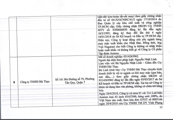 Theo báo cáo này của Tổng cục Quản lý thị trường, Công ty cổ phần Tập đoàn Asanzo tại địa chỉ Toà nhà Flemington Tower số 182 Lê Đại Hành ( Quận 11) chỉ gồm bộ phận kế toán và văn phòng, không có hoạt động sản xuất, chứa trữ hàng hoá.
