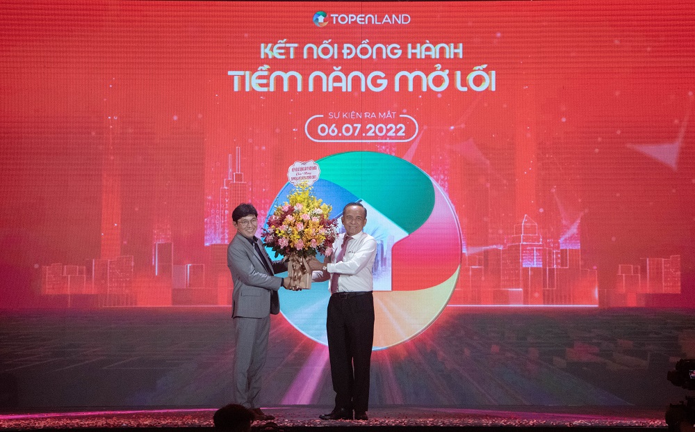Chủ tịch Hiệp hội BĐS TP.HCM Lê Hoàng Châu (phía phải), tặng hoa cho Tổng Giám đốc TopenLand Trần Quang Trinh.