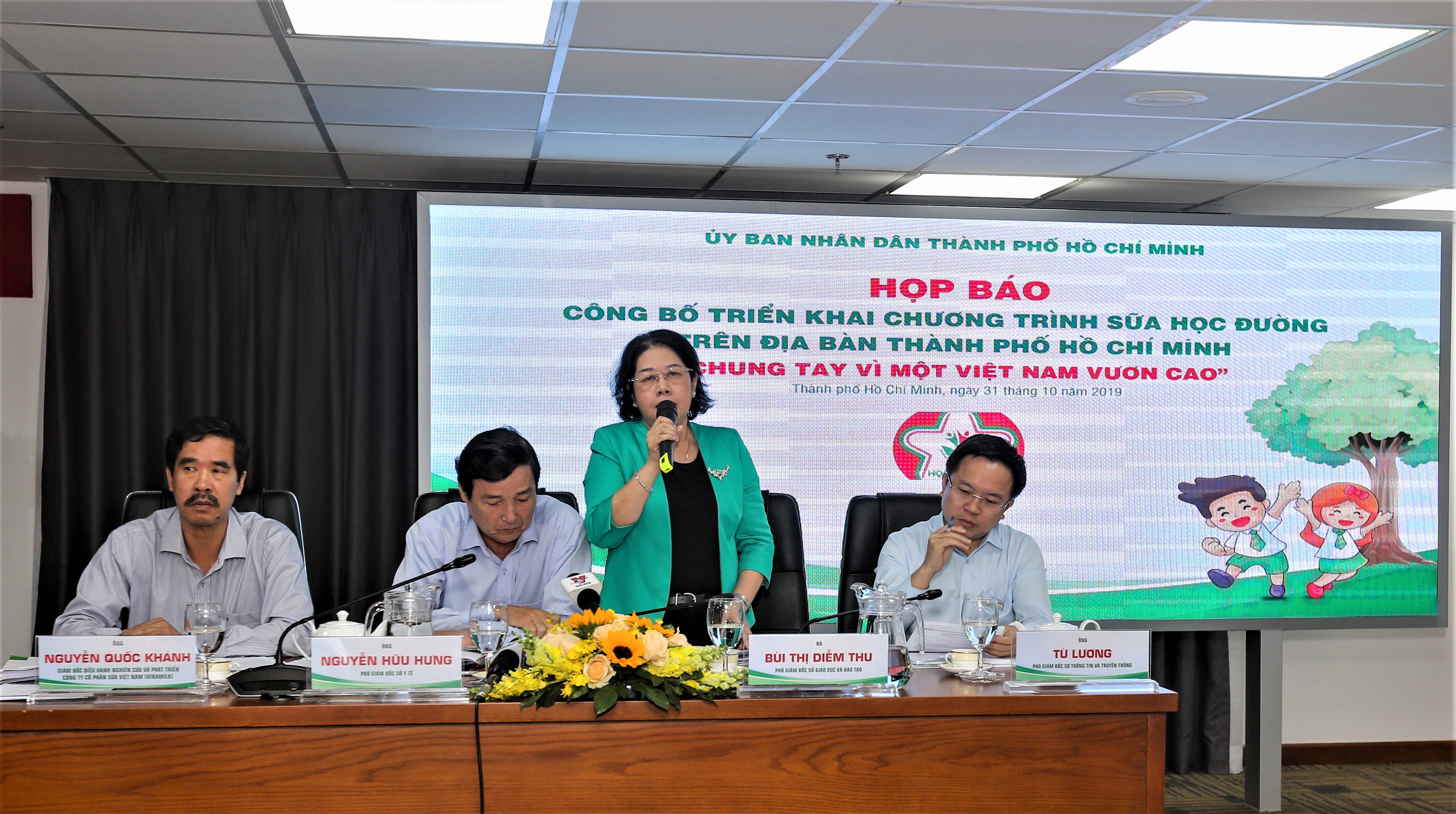Căn cứ Quyết định số 674/QĐ-UBND của UBND TP. Hồ Chí Minh về phê duyệt Đề án thực hiện Chương trình Sữa học đường cải thiện tình trạng dinh dưỡng góp phần nâng cao tầm vóc trẻ em mẫu giáo và học sinh tiểu học giai đoạn 2018-2020 trên địa bàn TP. Hồ Chí Minh, chiều 31/10/2019 tại Trung tâm Báo chí Thành phố, UBND Thành phố đã tổ chức họp báo công bố triển khai chương trình Sữa học đường trên địa bàn TP. Hồ Chí Minh, với chủ đề “Chung tay vì một Việt Nam vươn cao”.
