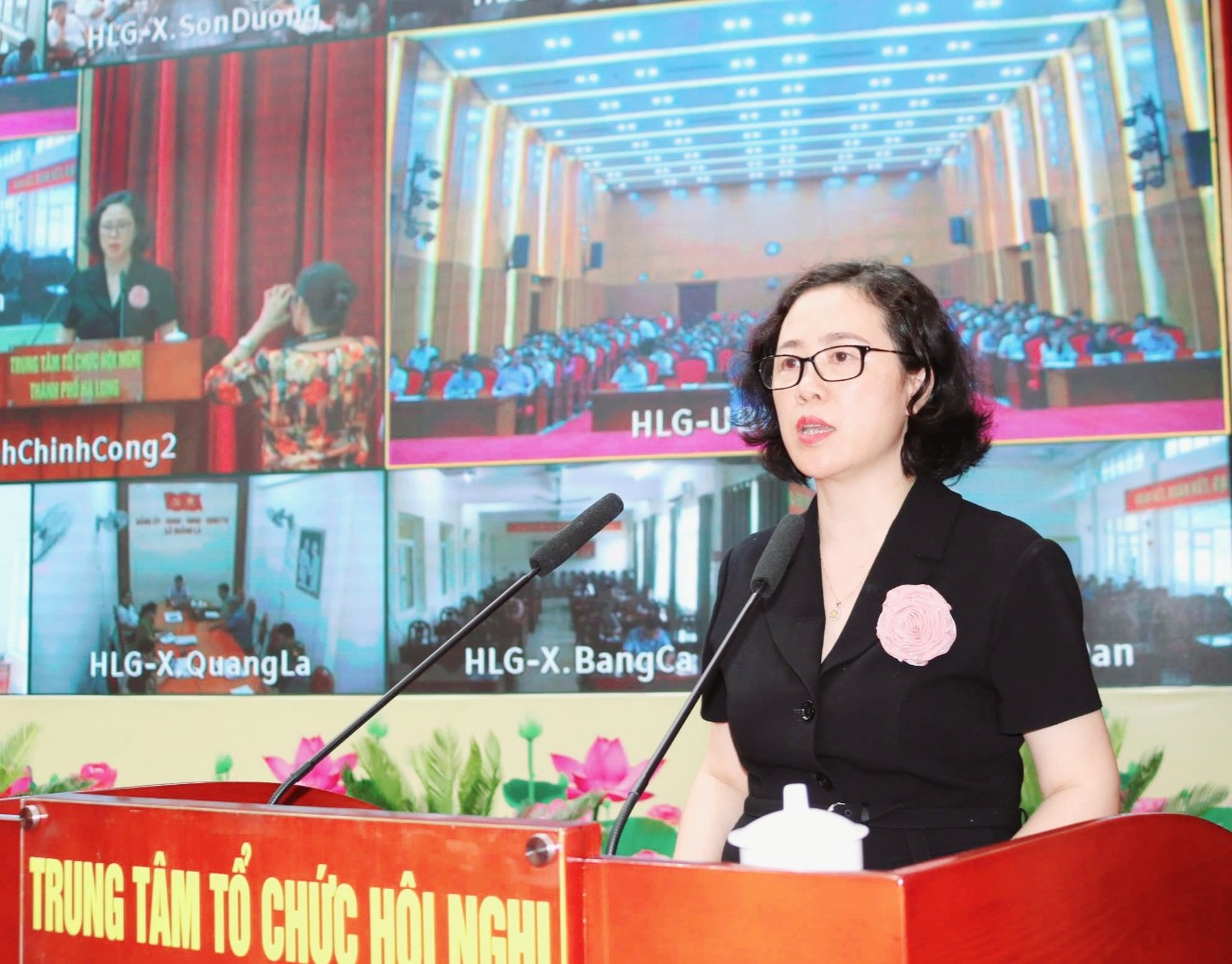 Đồng chí Vũ Thị Mai Anh - Phó Bí thư thành ủy, Chủ tịch HĐND thành phố Hạ Long phát biểu tại hội nghị.