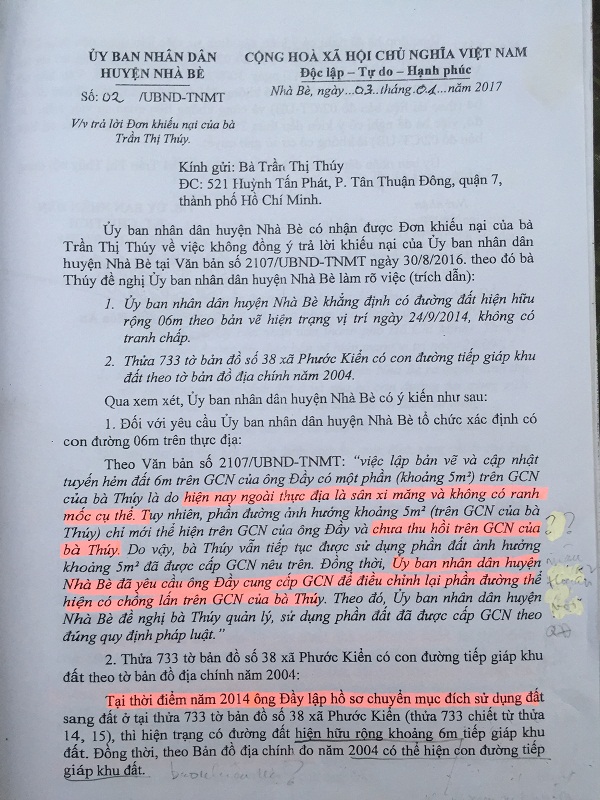 Theo đơn khởi kiện, bà Trần Thị Thúy được cấp Giấy chứng nhận quyền sử dụng đất (QSDĐ) tại thửa số 758, tờ bản đồ số 38 xã Phước Kiển, huyện Nhà Bè, giáp ranh đường bờ rãnh ở phía trong là đất của ông Nguyễn Văn Đầy, thuộc thửa 733, tờ bản đồ số 38. Đến tháng 8/2014, ông Đầy xin chuyển mục đích SDĐ ở, diện tích 893,7m2 nhưng không hội đủ điều kiện theo Quyết định số 19/2009/QĐ-UBND ngày 25/2/2009 và Quyết định số 54/2012/QĐ-UBND ngày 3/12/2012 của UBND TP.Hồ Chí Minh, do con đường đi vào thửa đất chỉ có chiều rộng 2m. Để hợp thức hóa hồ sơ, cán bộ duyệt bản vẽ và thụ lý hồ sơ, đã tự ý vẽ lại con đường từ 2m thành...6m, mà không xem xét nguồn gốc con đường 6m, kết nối vào hạ tầng kỹ thuật hiện hữu và cập nhật con đường vào Giấy chứng nhận QSDĐ của ông Đầy, nằm trên phần đất của bà Thúy. Không chỉ vậy, QSDĐ của bà Thúy còn bị xâm phạm nặng nề hơn khi các cơ quan chức năng huyện Nhà Bè cấp Giấy phép xây dựng cho ông Đầy, đã biến con đường 6m thành... 8m, tiếp tục lấn sâu thêm, làm thiệt hại đến quyền và lợi ích hợp pháp của bà Thúy. Do đó, bà Thúy làm đơn KN và UBND huyện Nhà Bè, lại trả lời KN bằng Công văn số 02/UBND-TNMT. Không đồng ý, bà Thúy tiếp tục gửi đơn KN.