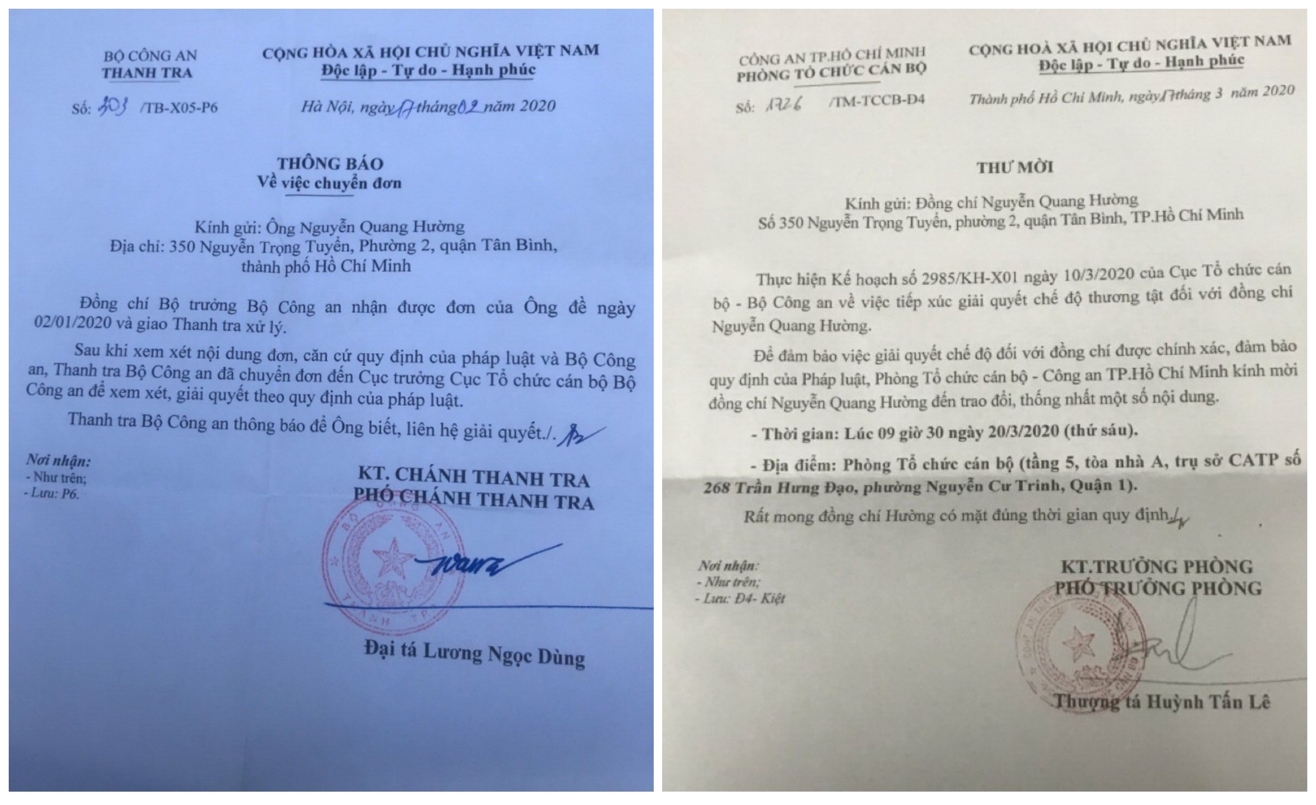 Thông báo số 303/TB-X05-P6 của Thanh tra Bộ Công an (ảnh trước) và Thư mời số 1726/TM-TCCB-D4 của Phòng TCCB - Công an TPHCM (ảnh sau)