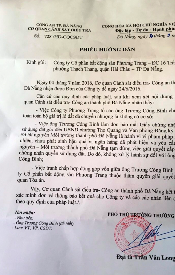 Sau khi tố cáo ông Bình đến Công an TP Đà Nẵng không thành, Công ty CPBĐS Phương Trang và Công ty CP Đầu tư Phương Trang, tiếp tục tố cáo ra Cơ quan CSĐT (C01) Bộ Công an và đơn vị này yêu cầu tòa dừng vụ án!