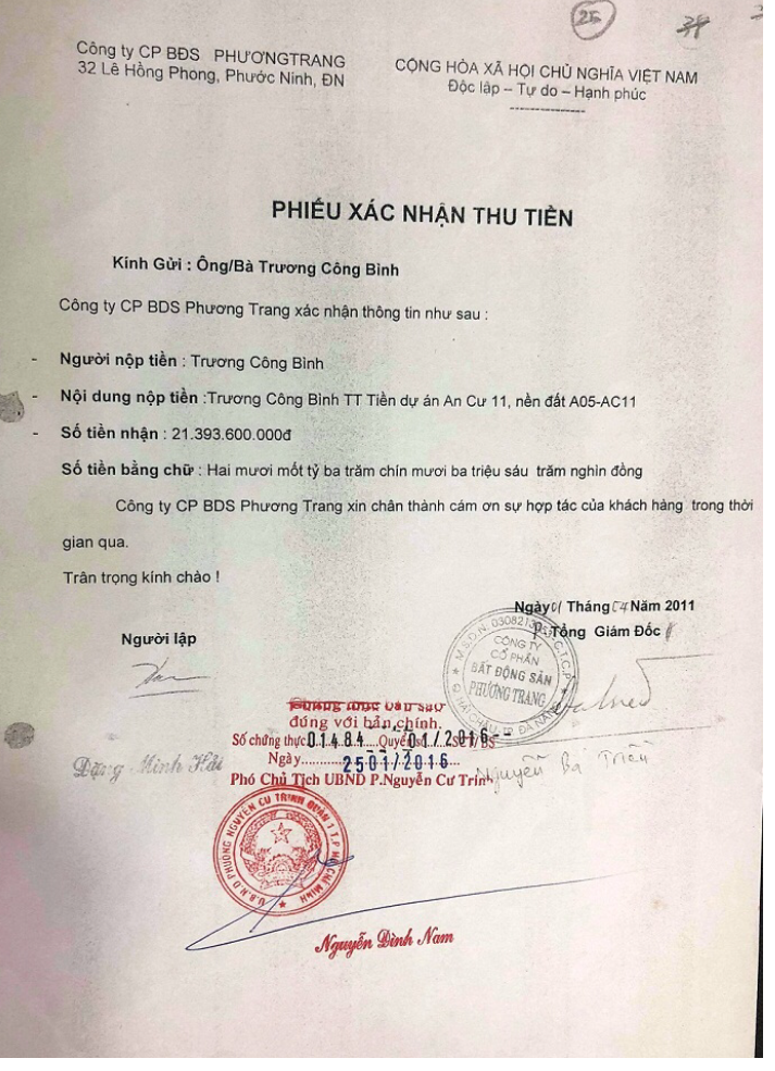 | Phiếu xác nhận Công ty CPBĐS Phương Trang đã thu hơn 21,3 tỷ đồng |