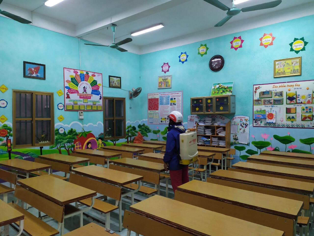 Trước diến biến hết sức phức tạp và nguy hiểm, Ban Giám hiệu Nhà trường đã chủ động phối kết hợp với Hội cha mẹ học sinh và Trạm y tế xã tổ chức phun thuốc phòng ngừa dịch bệnh trong và ngoài các phòng học, khuôn viên trường, bếp ăn, nhà vệ sinh... sáng ngày 01/02.