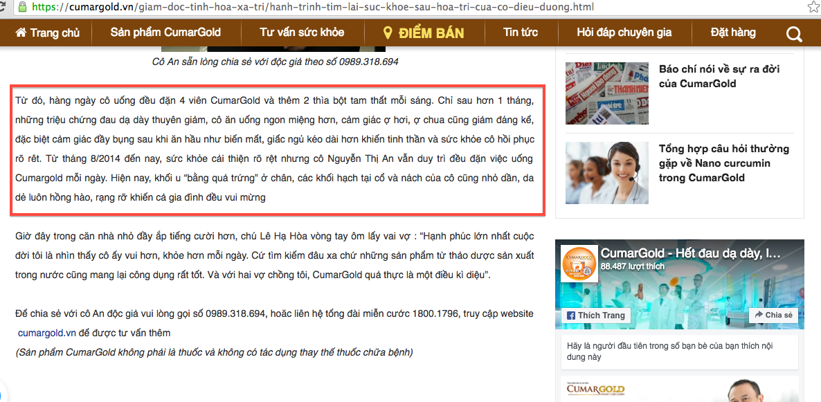 Hay như bài quảng cáo “Hành trình tìm lại sức khỏe sau hóa trị của cô điều dưỡng” với nội dung: “Hàng ngày cô uống đều đặn 4 viên CumarGold và thêm 2 thìa bột tam thất mỗi sáng. Chỉ sau hơn 1 tháng, những triệu chứng đau dạ dày thuyên giảm, cô ăn uống ngon miệng hơn, cảm giác ợ hơi, ợ chua cũng giảm đáng kể, đặc biệt cảm giác đầy bụng sau khi ăn hầu như biến mất, giấc ngủ kéo dài hơn khiến tinh thần và sức khỏe cô hồi phục rõ rêt. Từ tháng 8/2014 đến nay, sức khỏe cải thiện rõ rệt nhưng cô Nguyễn Thị An vẫn duy trì đều đặn việc uống Cumargold mỗi ngày. Hiện nay, khối u “bằng quả trứng” ở chân, các khối hạch tại cổ và nách của cô cũng nhỏ dần, da dẻ luôn hồng hào, rạng rỡ khiến cả gia đình đều vui mừng”.