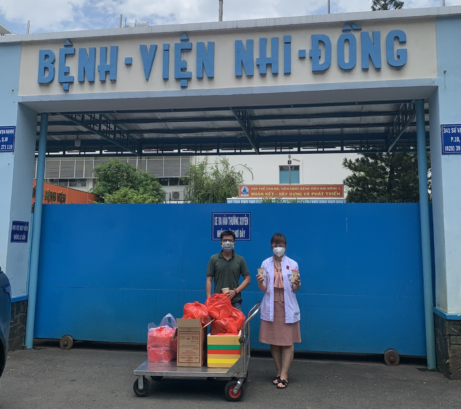 Điều dưỡng trưởng Nguyễn Thị Rảnh – BV Nhi Đồng I đích thân ra tiếp nhận sản phẩm.