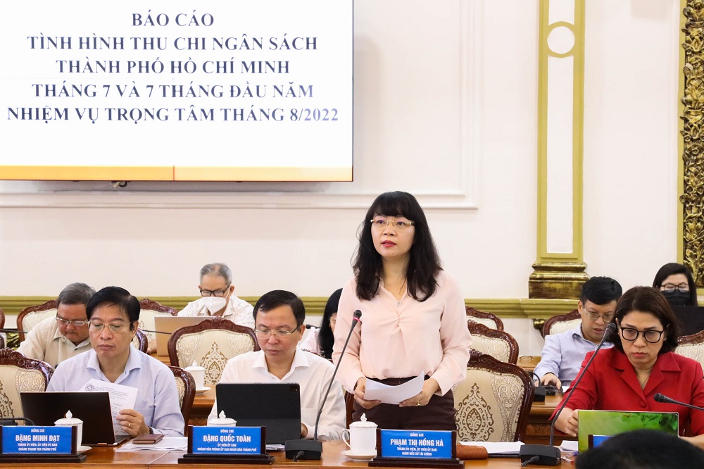 Giám đốc Sở Tài chính TP Hồ Chí Minh Phạm Thị Hồng Hà báo cáo tình hình thu chi ngân sách tại phiên họp.