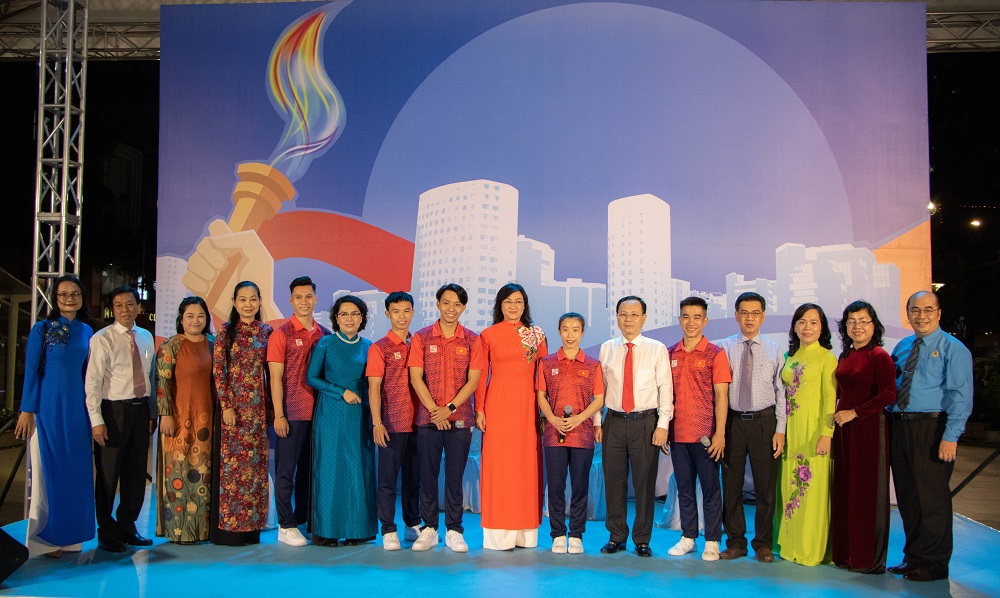 Đoàn đại biểu chụp ảnh cùng các vận động viên trẻ TP Hồ Chí Minh có thành tích xuất sắc trong Sea Games 31 vừa qua.