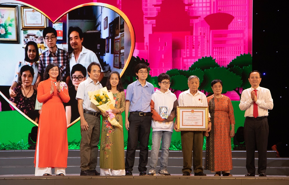 Gia đình 3 thế hệ của Lê Văn Sứ và bà Nguyễn Thị Bích Dương (Quận 5) nhận bằng khen hộ gia đình văn hóa, hạnh phúc tiêu biểu.