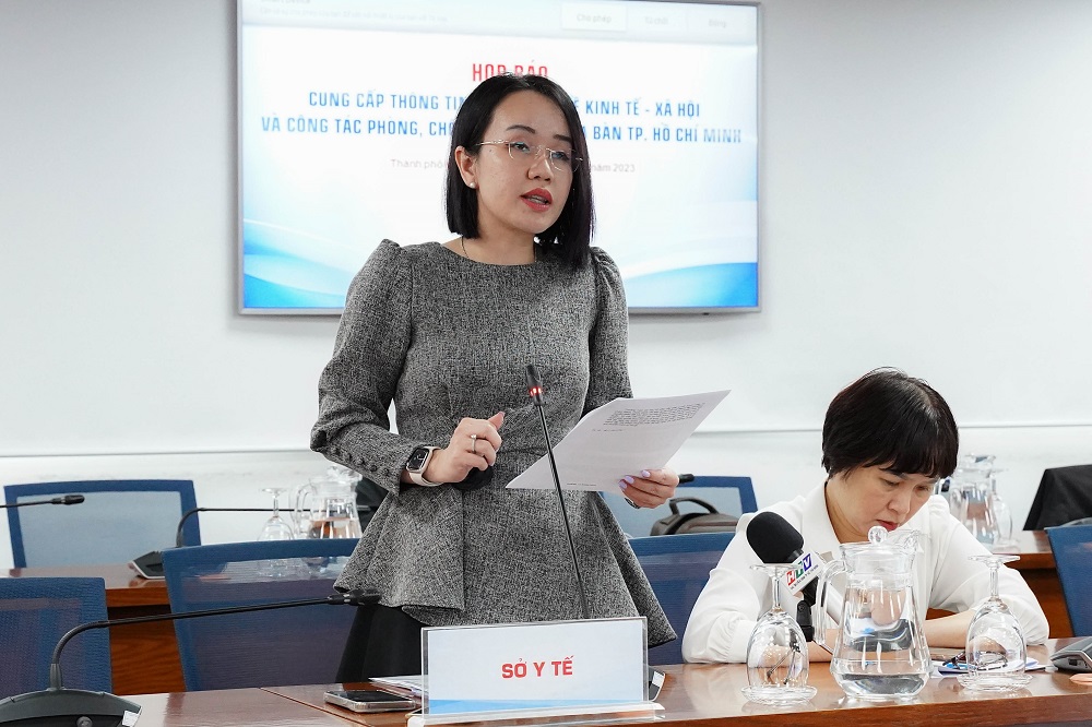 Phó Chánh văn phòng Sở Y tế Thành phố Lê Thiện Huỳnh Như cung cấp thông tin tại họp báo.