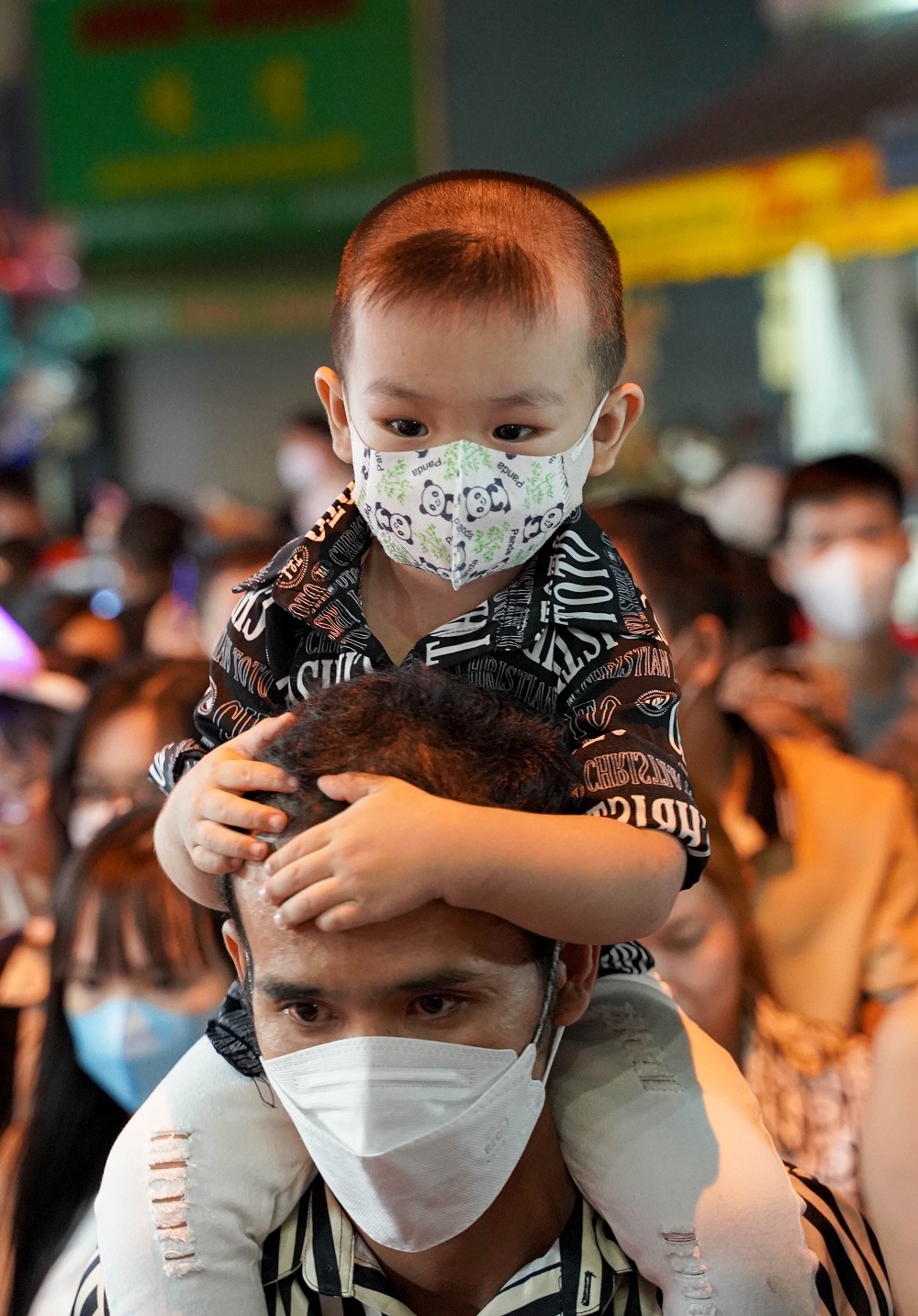 Để tránh tình trạng chen lấn cùng người lớn, em nhỏ được bố cõng trên vai để tham quan.