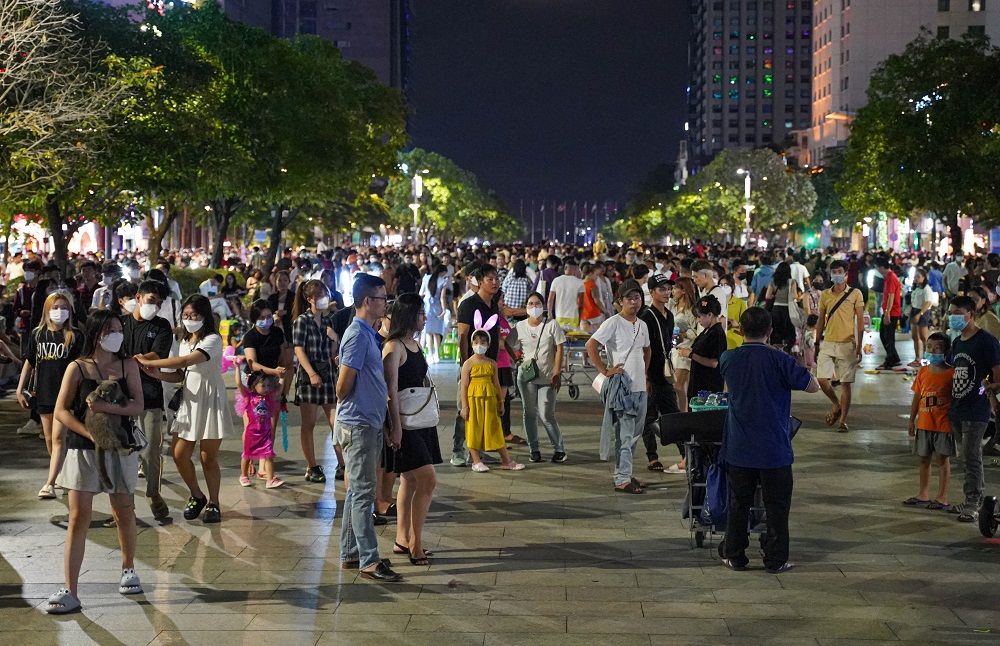 Phố Đi bộ Nguyễn Huệ (Quận 1) cũng trở nên đông đúc trong ngày hội trăng rằm. Mặc dù đã qua 22h00 nhưng vẫn có hàng trăm người có mặt tại đây để vui chơi. Nhiều bạn trẻ tập hợp thành nhóm để trò chuyện và hát với nhau khiến không khí của cả tuyến phố trở nên nhộn nhịp.