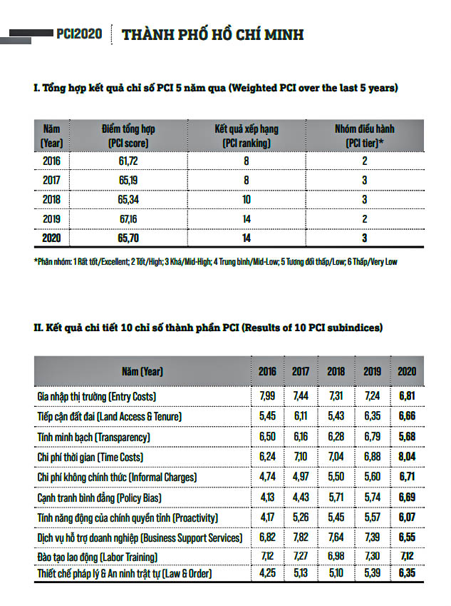 Bảng chỉ số PCI của TP.HCM giai đoạn 2016 - 2020. Nguồn: PCI Việt Nam.