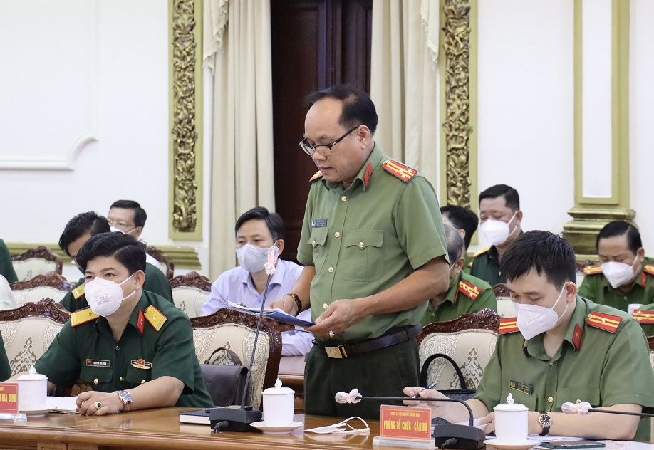 Thượng tá Huỳnh Tấn Lê, Phó Trưởng phòng tổ chức cán bộ, Công an TP.HCM báo cáo tại cuộc họp - Ảnh: TTBC TP.HCM