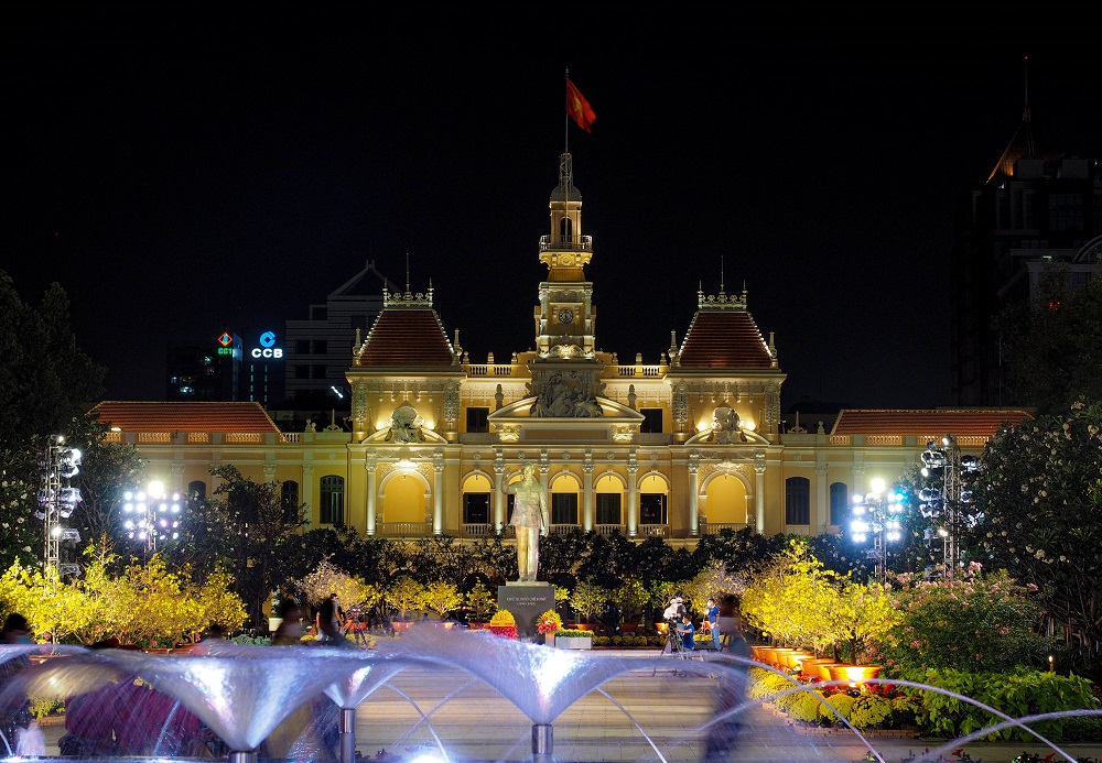 UBND TP.HCM góc nhìn từ Đường hoa Nguyễn Huệ (Quận 1).